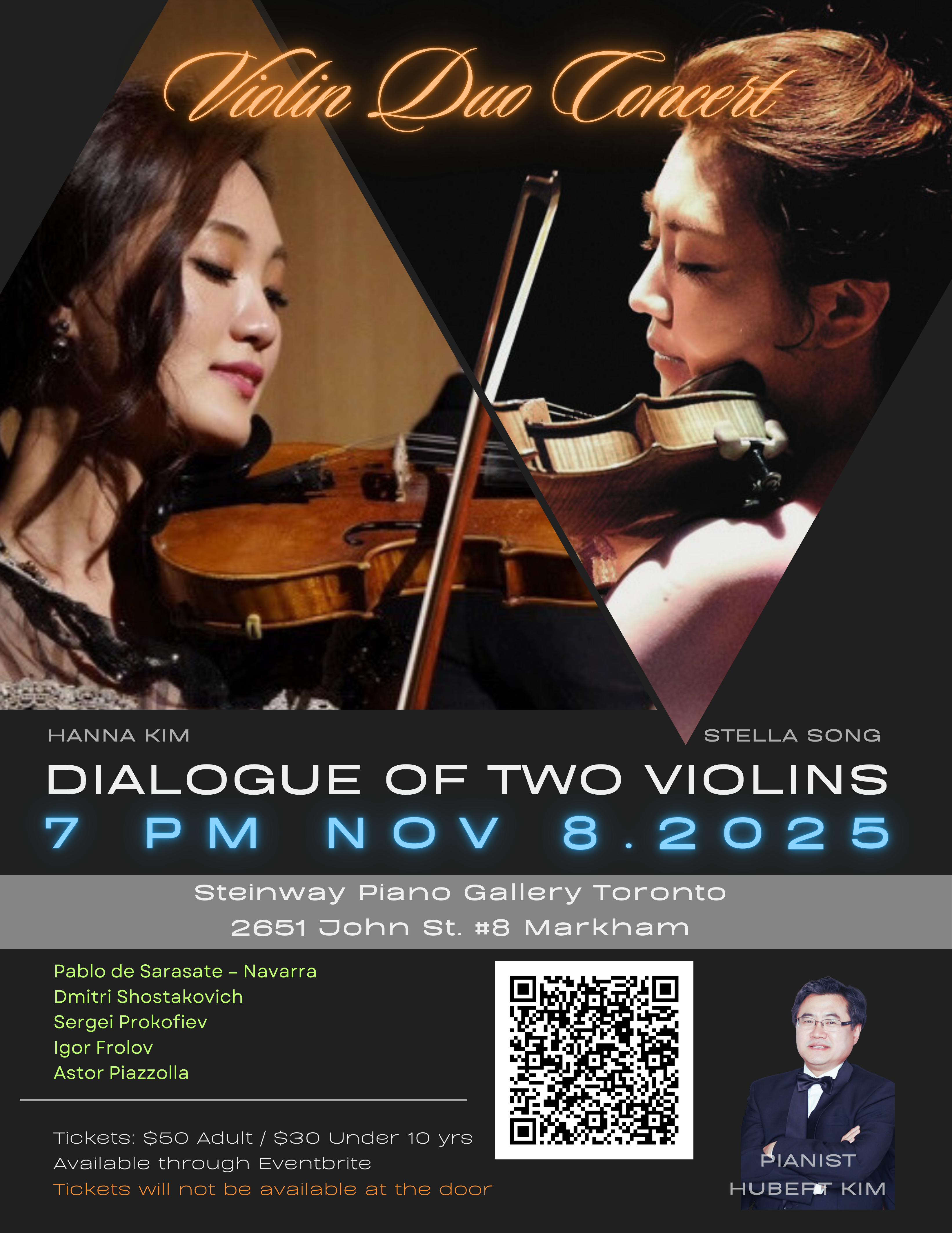 An evening of dazzling violin duets featuring Hanna Kim and Stella Song, joined by pianist Hubert Kim.